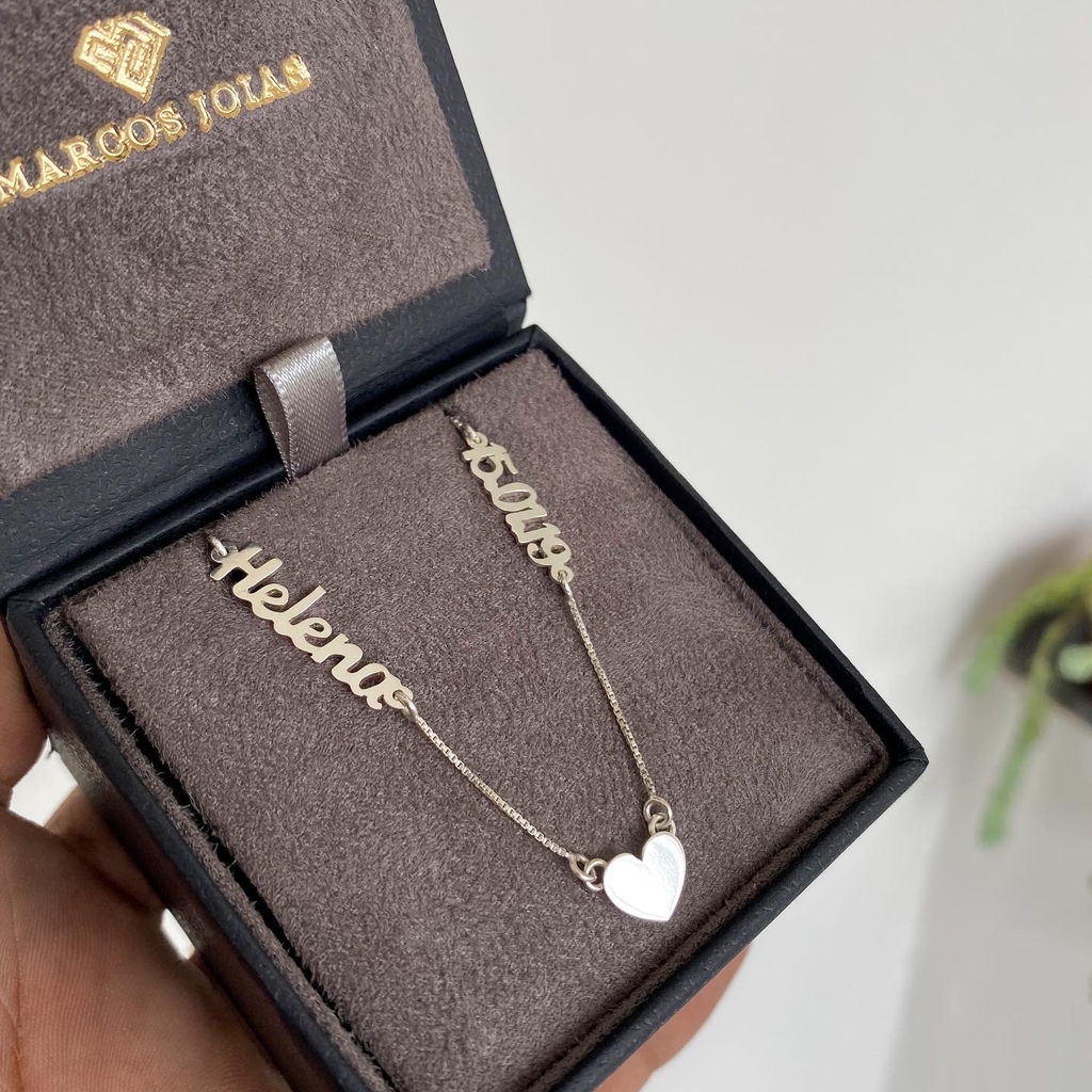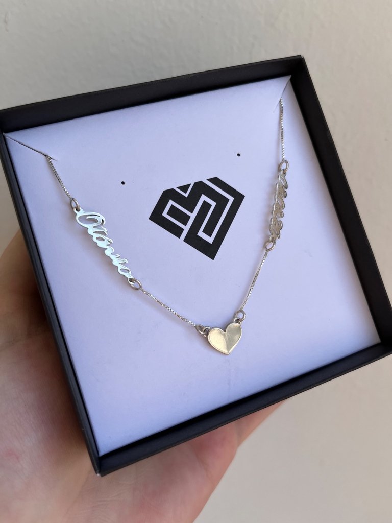 Detalhes: 1 colar personalizável com nomes nas laterais e um coração no centro. Disponível em ouro e prata.
